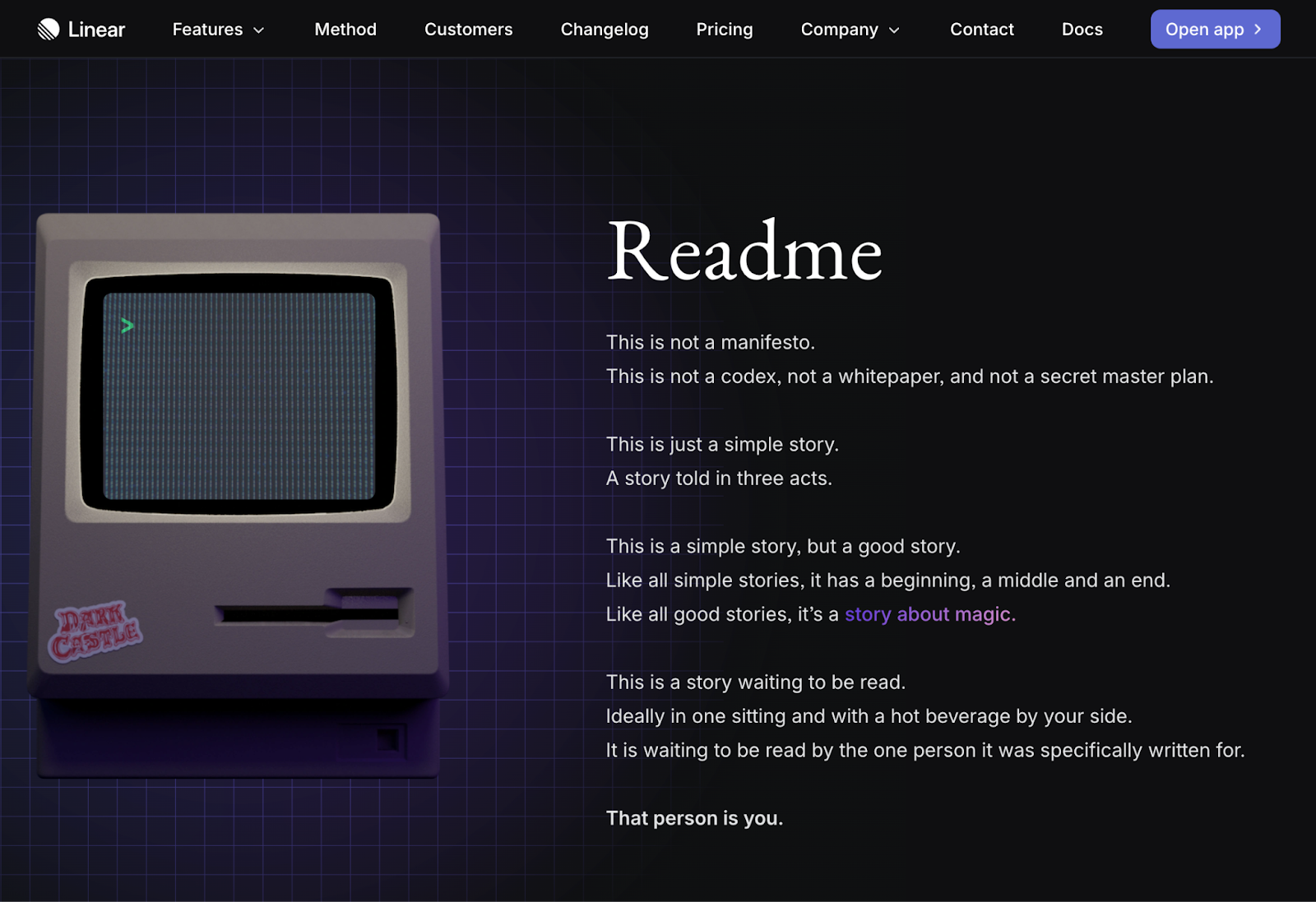 Linear, the heartthrob of Silicon Valley startups, captures the magic of conviction. Their entire ethos revolves around crafting strongly opinionated, professional grade software. In lieu of novelty, they’ve created magic through sheer excellence. They have a whole webpage that reads like a love letter to builders, recounting a “story about magic” and the tagline on their jobs site is “Software has lost its magic. We want your help to bring it back.” They write, “Today, software is everywhere. But truly great software has become incredibly rare. Computers are faster, but apps work slower. Craftsmanship has been replaced with growth hacks. Visionary product ideas turned into incremental changes.” As a software builder, I can absolutely feel their conviction, and I love it. Their founders write highly opinionated pieces on “Rethinking the startup MVP”, talking about how “Today's Minimum Viable Product (MVP) is often about building a better version of an idea, not validating a novel one. It’s not good enough to be first with an idea. You have to out-execute from day 1.” As software that helps build more software, they know their audience of founders and builders want a battle-hardened, flawless product that inspires them to build experiences that twinkle with magic. I’m starstruck.