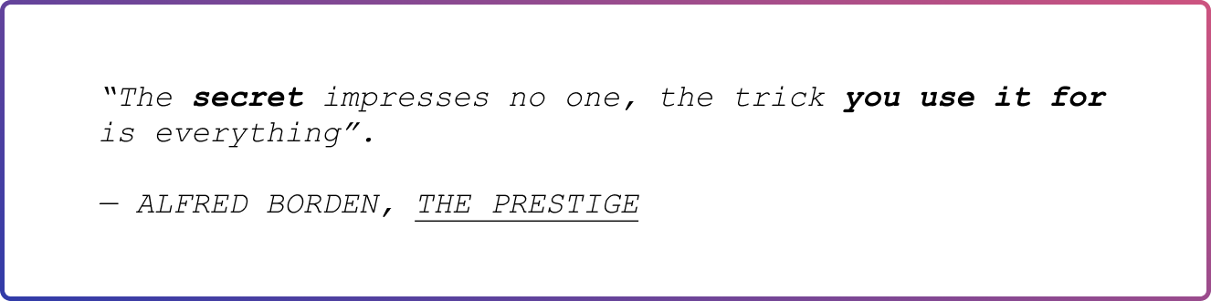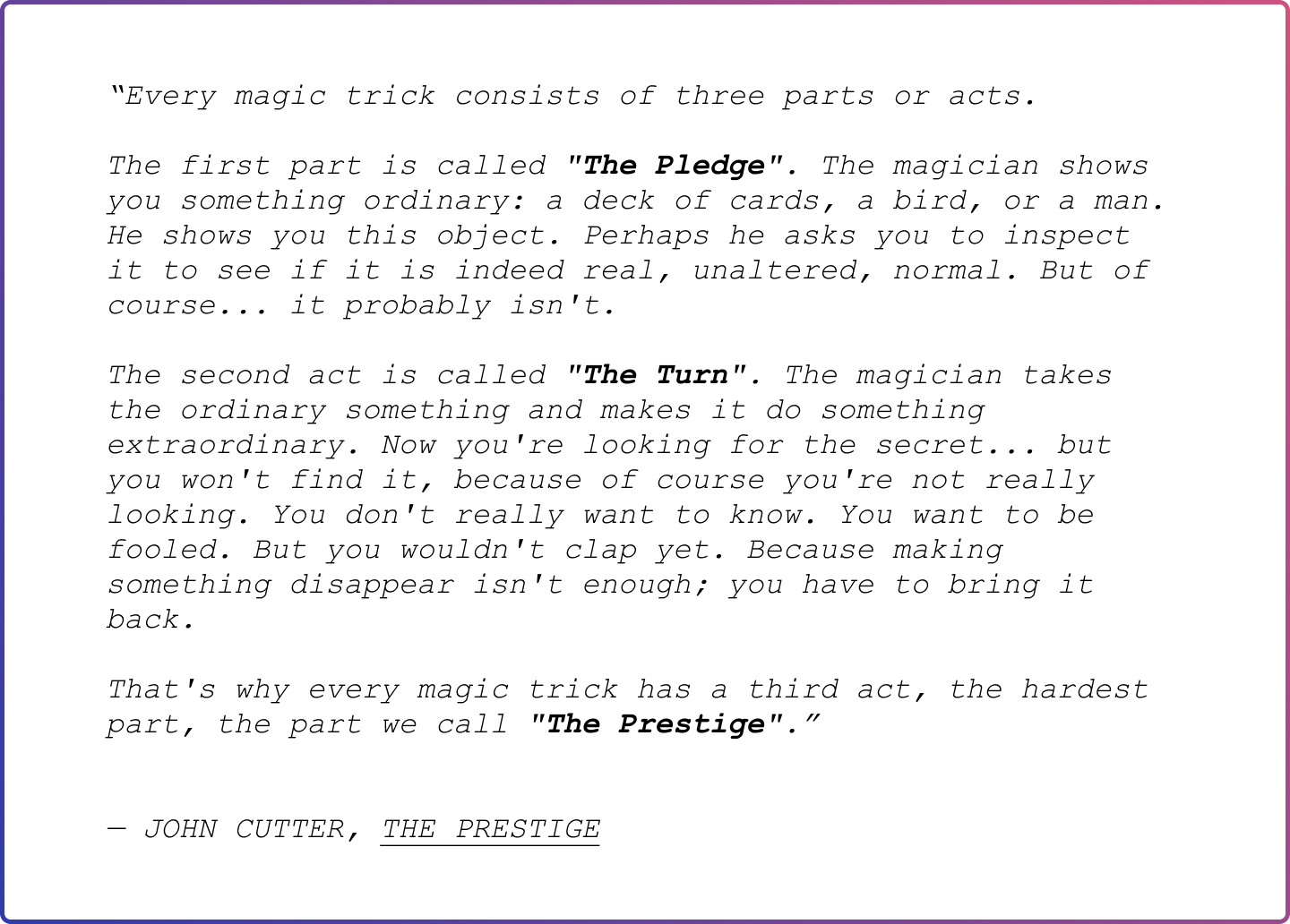 Magic isn’t made by just turning the ordinary into the extraordinary. The audience wouldn’t find this by itself compelling. It’s the last act, “The Prestige”, that really makes magic matter. The magician lets you in on a little secret, they tell you what’s coming, and then actually make it happen. But making it isn’t enough. You need to make the audience a part of the magical act itself. You need to make them experience the magic in a unique way for them to care.