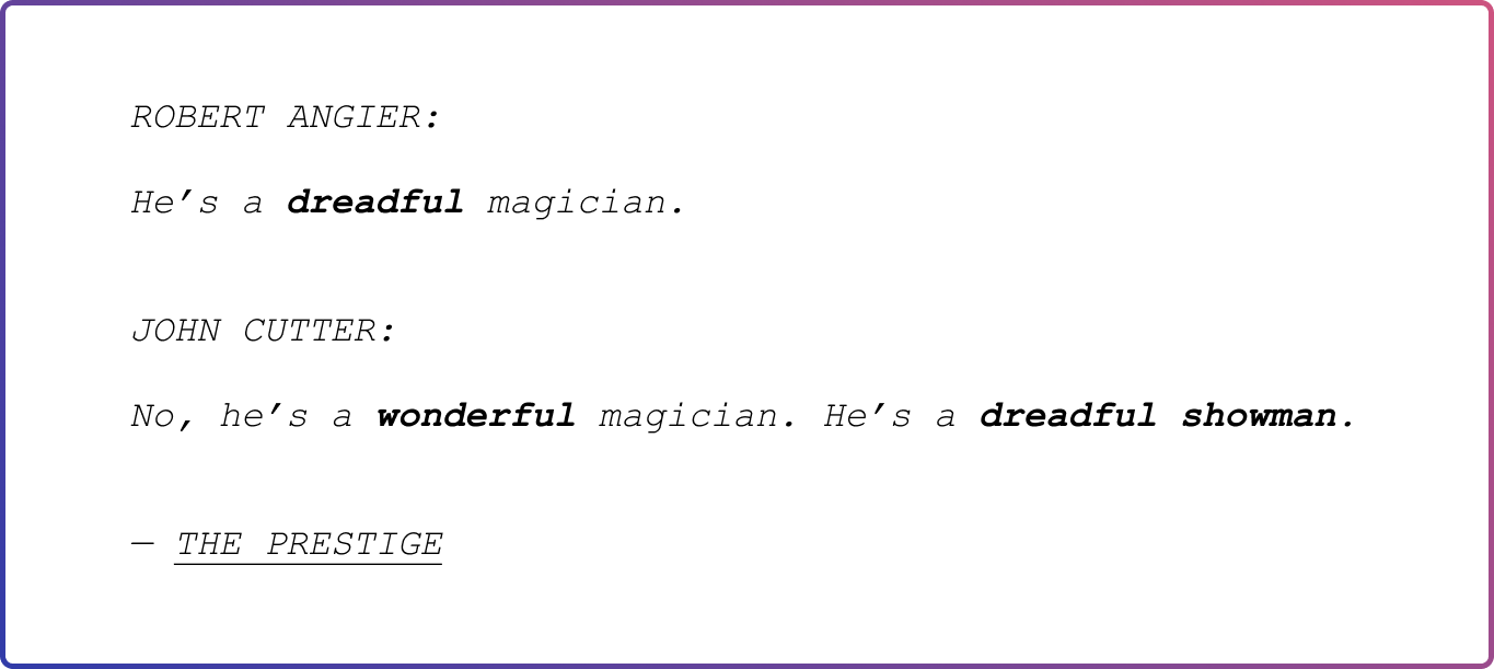 The greatest irony is that making magic doesn’t actually come from the making, but the method of presentation and following effect. I’m not advocating for vain showmanship, but simply highlighting how important the prestige moment really is. Christopher Nolan’s film, The Prestige, tells the tale of two magicians feuding over the “perfect” magic trick they call “The Transported Man”. Alfred Borden (Christian Bale) enters a wardrobe and instantly transports himself across the stage. The trick is amazing, but the showmanship is lacking. Perhaps in an ideal world the trick itself should be magical, but in the real world, the prestige moment is too weak for magic to appear. His rival magician, Robert Angier (Hugh Jackman), does the exact same trick, with more hype (and electricity) and receives a roaring ovation. All else equal, the method of presentation trumps all.