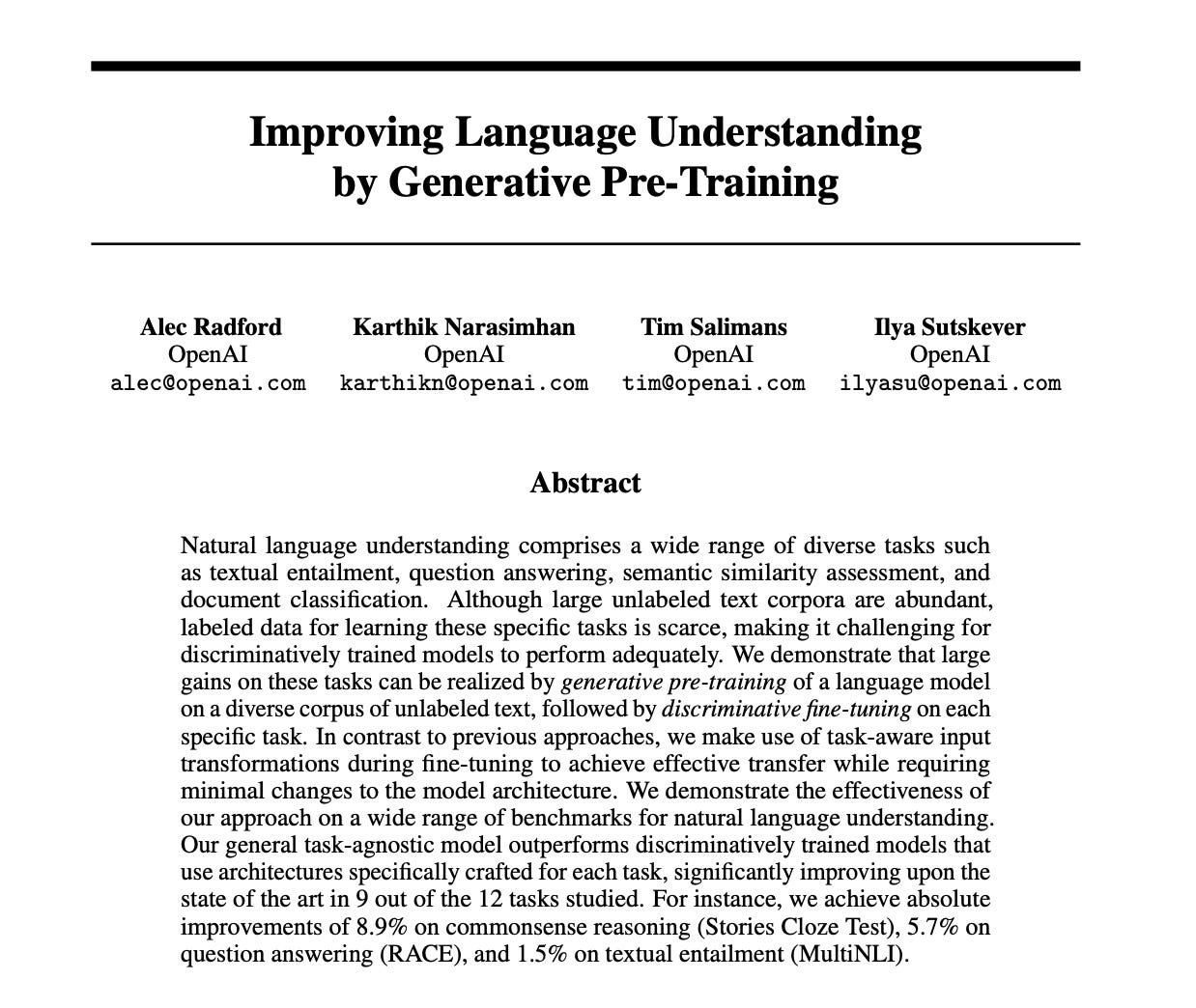 OpenAI was founded in 2015 by a small group of researchers dedicated to building artificial general intelligence (AGI) in a safe and purposeful way. They used standard ML techniques, massive datasets and iterated on optimizing LLM transformer architecture producing many important research papers in the process, including the paper that introduced the GPT architecture, a precursor to many of today’s transformer-based models. The paper outlined novel pre-training strategies using language modeling objectives which were fine-tuned for specific tasks. But even this original GPT-architecture-defining paper was rejected from a major ML conference, the International Conference on Learning Representations, for not being groundbreaking enough. Even the insiders found the findings relatively “ordinary”, but the concepts introduced in the original paper paved the way for more advanced models like GPT-2 and GPT-3.